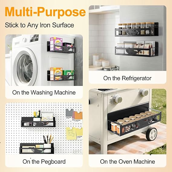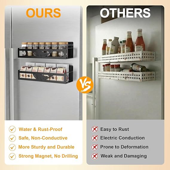 - Extra Strong Magnetic Hold – No Drilling Needed: Powerful magnets attach firmly to any metal surface like your fridge or oven. No tools or screws required — stays secure even when fully loaded with spice jars.