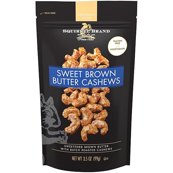 • Contains 1- 3.5 Ounce resealable stand up bag of Squirrel Brand Sweet Brown Butter Cashews